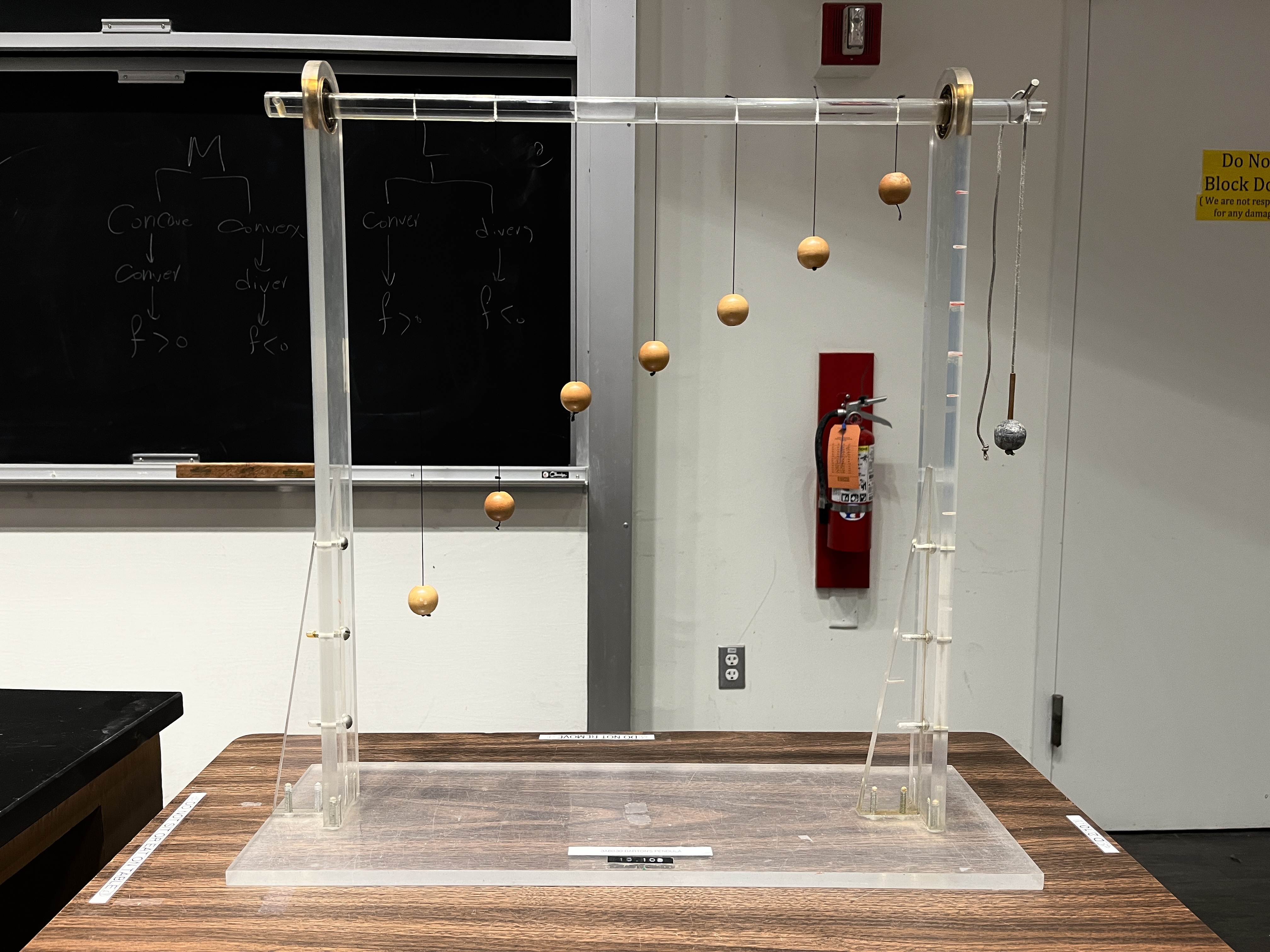 - Demonstration has an adjustable driving pendulum that rotates a long axle