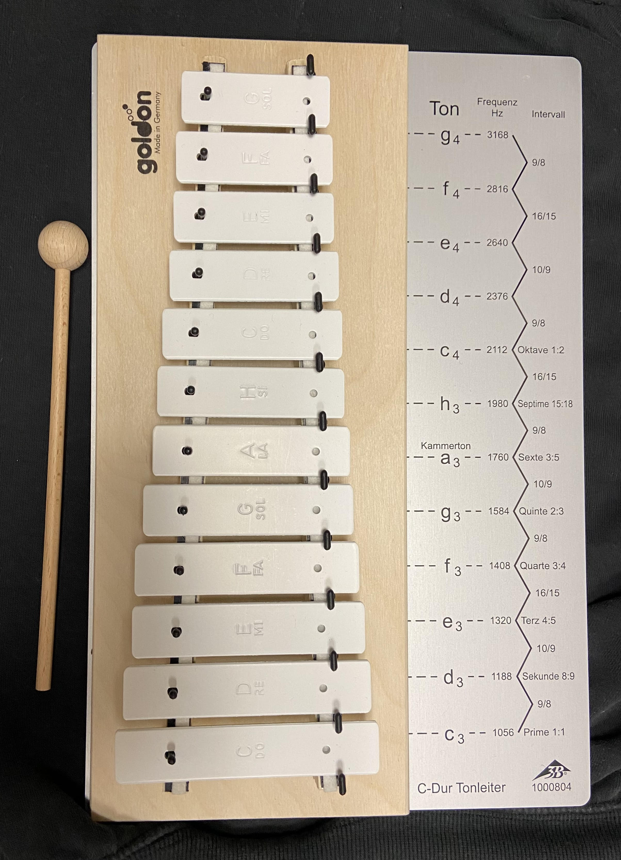- Using the mallet, strike one of the metal bars. You will hear a specific frequency resonating depending on which bar was struck.
