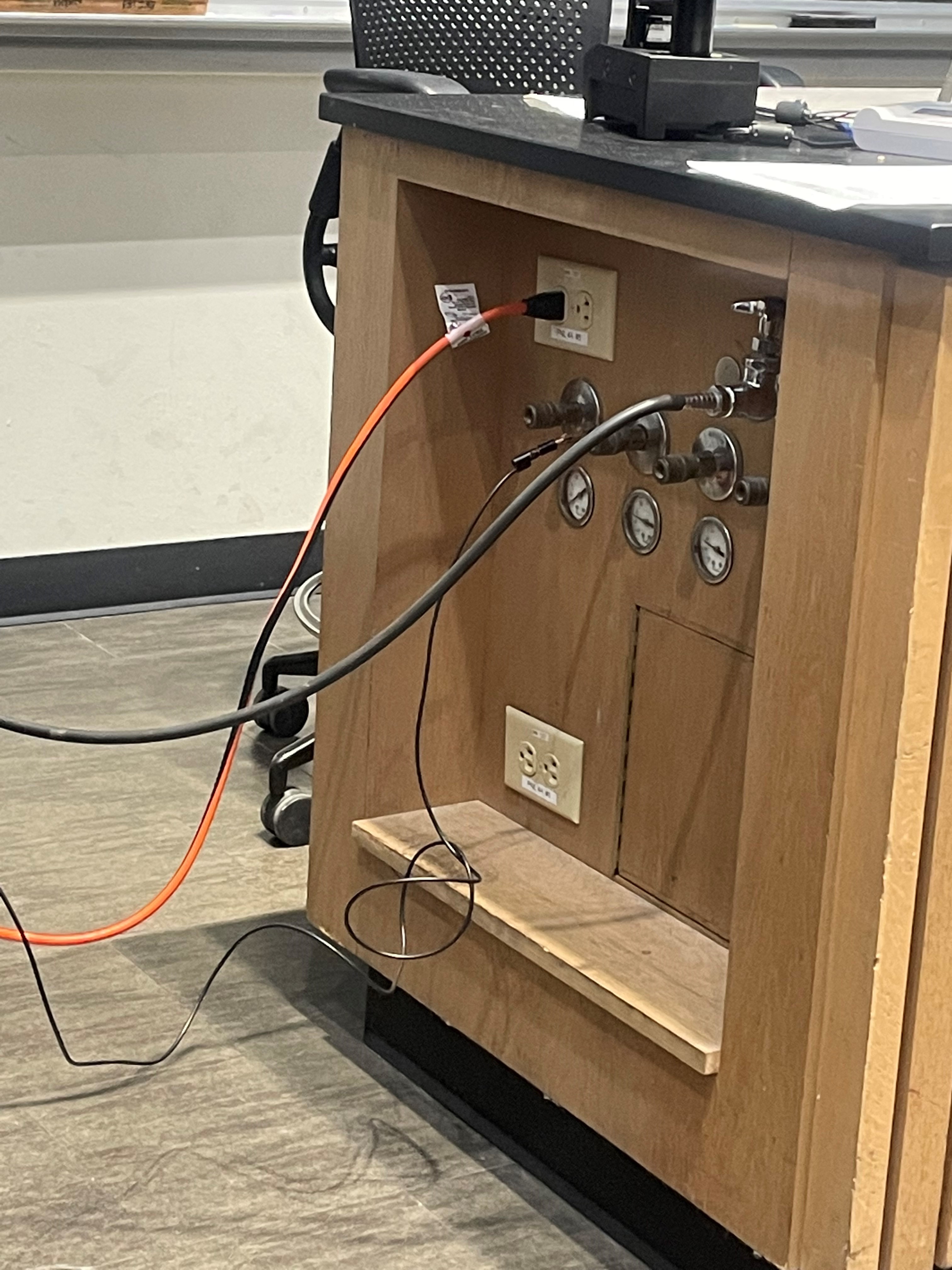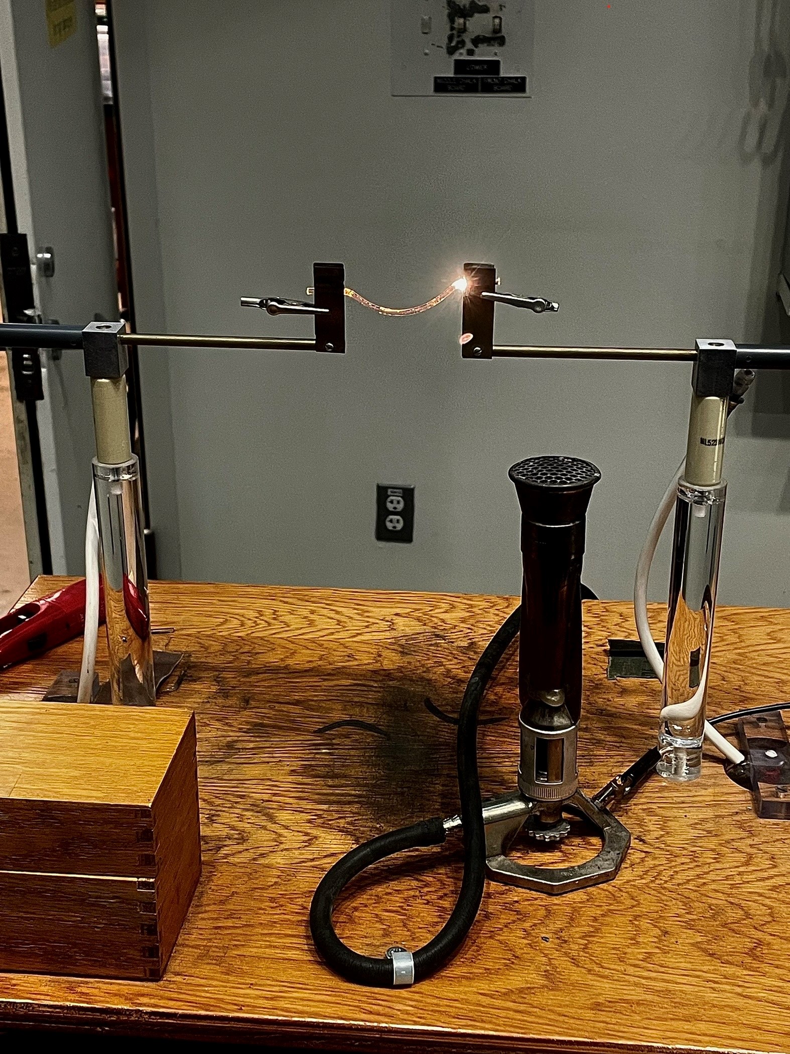 - In the classroom, ground Bunsen burner by clipping one end of a wire to the burner itself and the other end to a port next to the gas port (refer to photo of setup below).