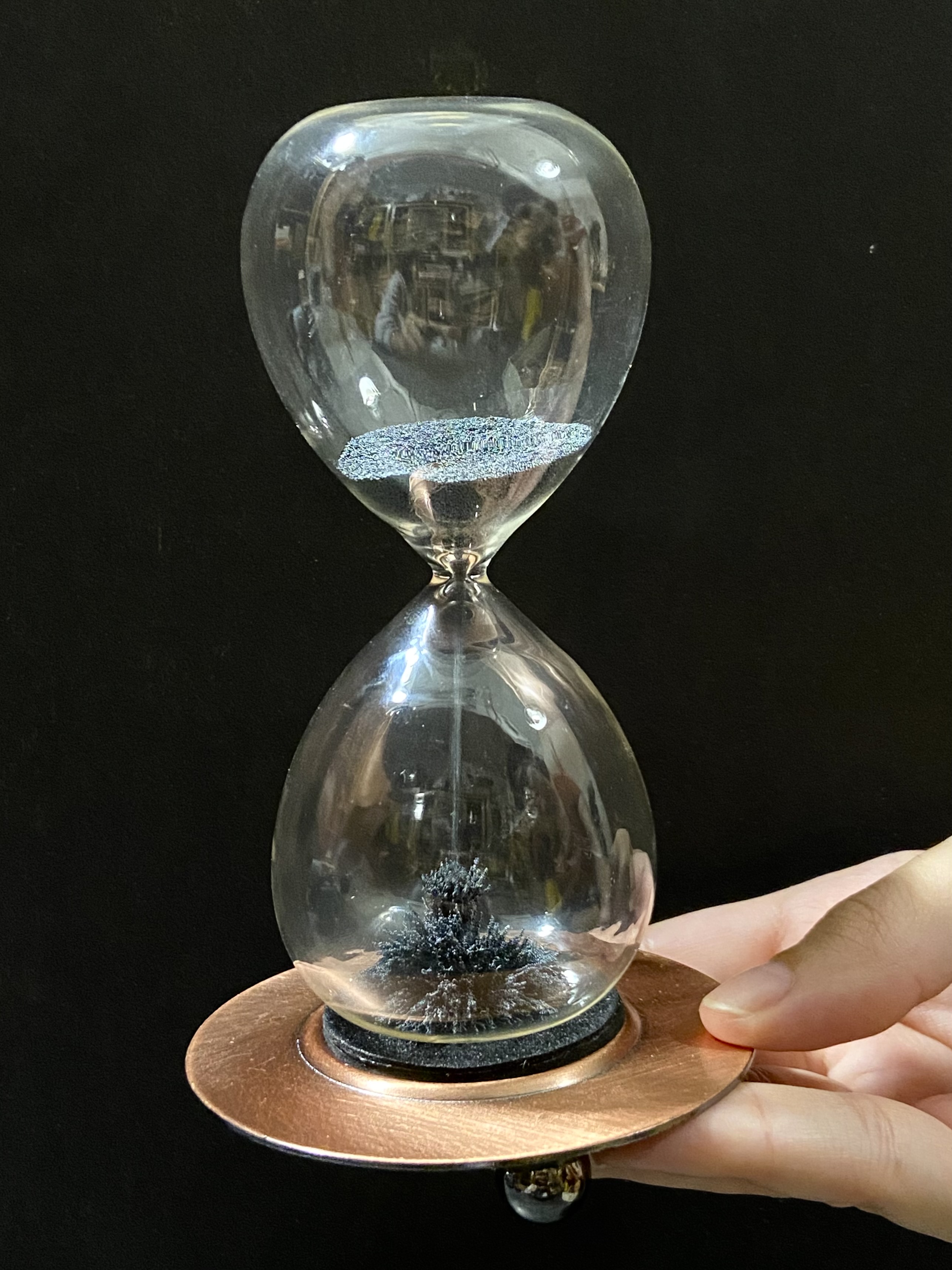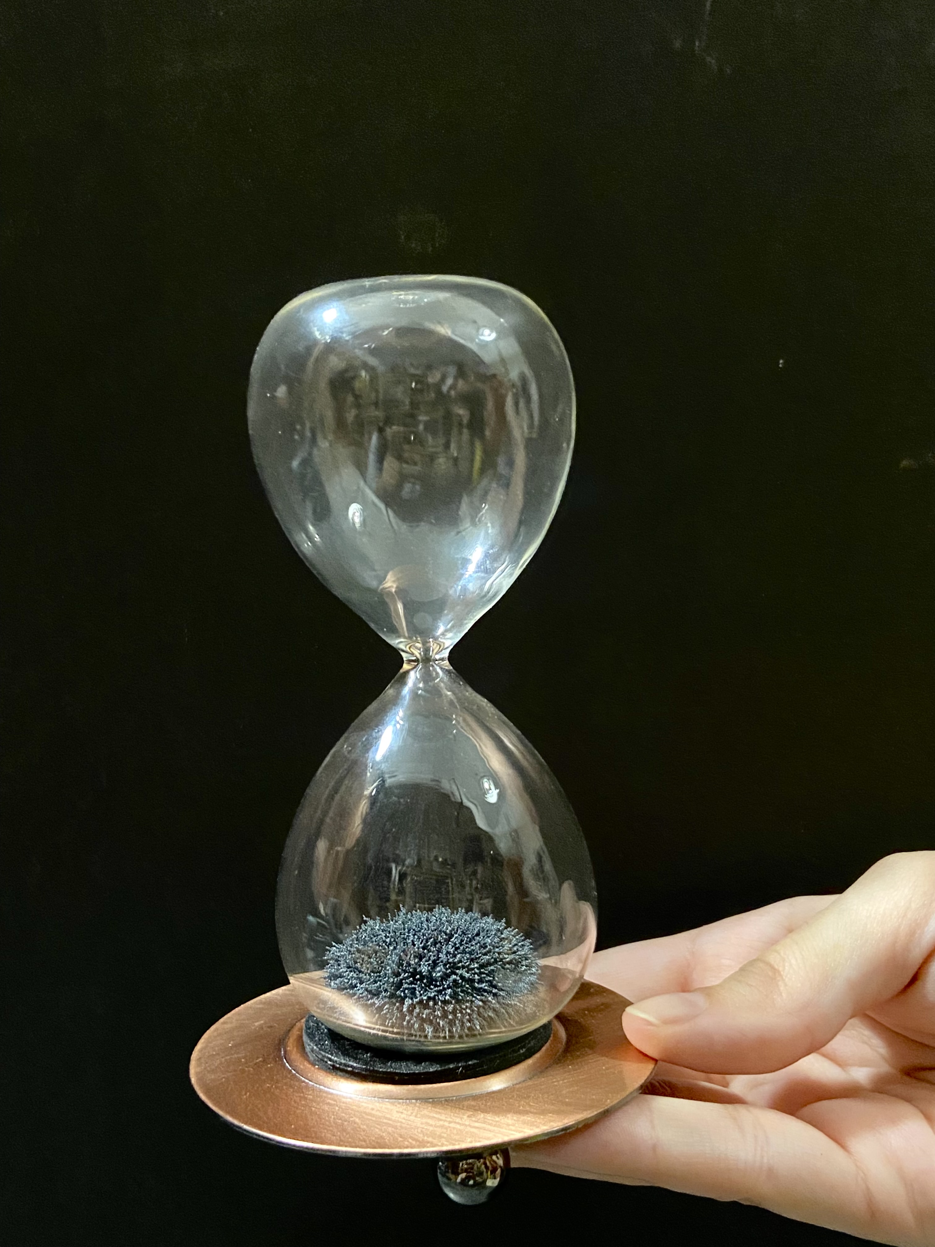 - Flip the hourglass onto the magnet provided and observe the arrangement of the iron filings inside.