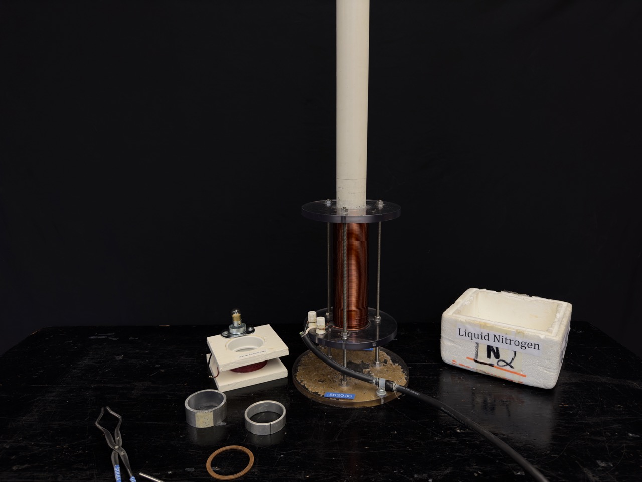 - Two aluminum rings, one with a thin slit cut out and other being solid all the way around, are place around the core a large coil.