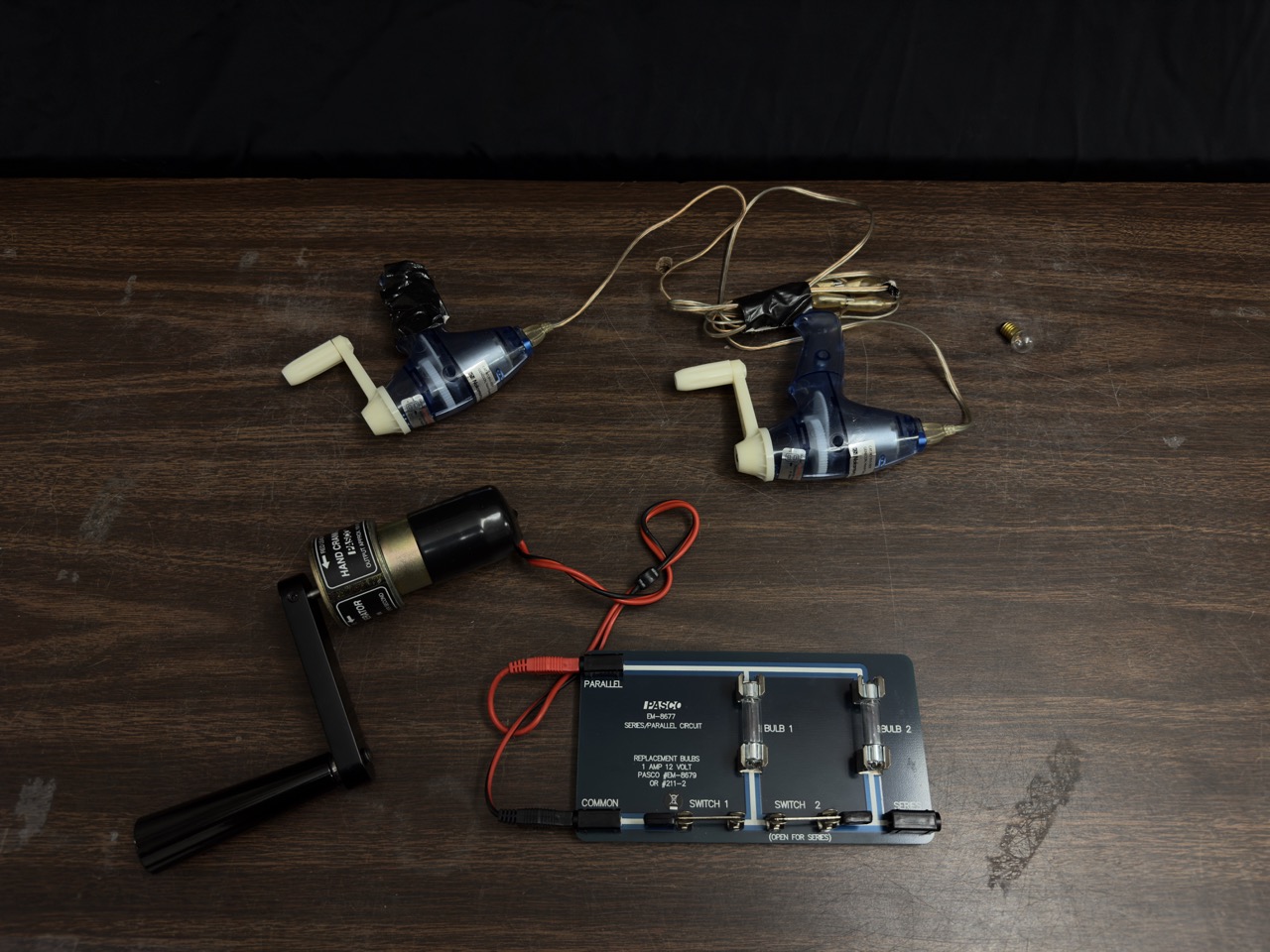 - Another, more robust DC generator is connected to one or two automotive light bulbs.