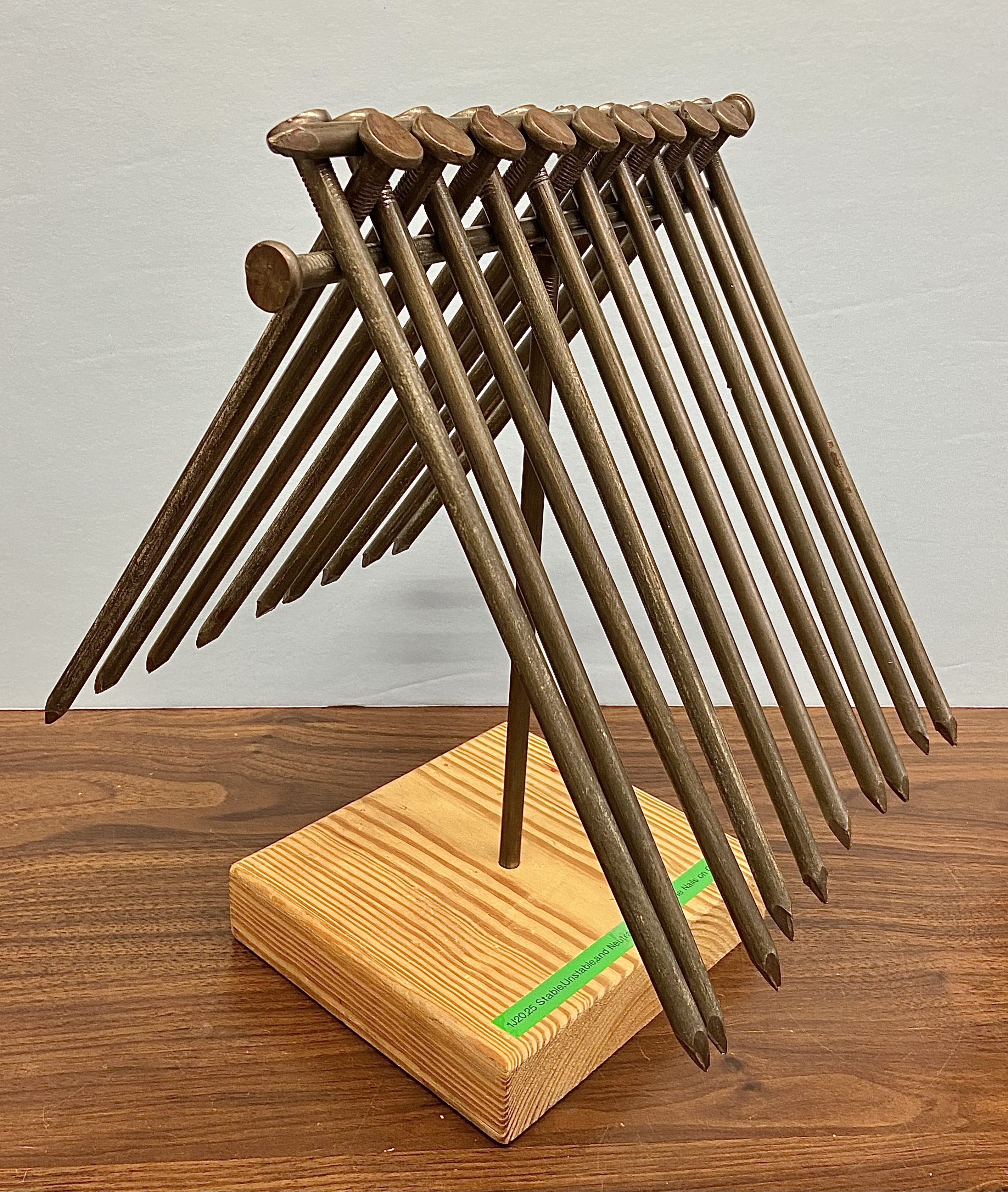 - Nine nails are hanging on each side, and two nails are horizontal, holding them in place.