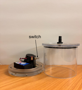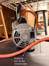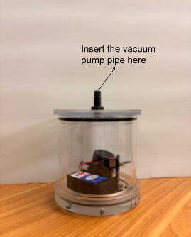 - Insert the vacuum pipe into the black portion sticking out of the container on top, and turn on the vacuum pipe using the switch (make sure you have connected the vacuum pump to an outlet using the white cable).