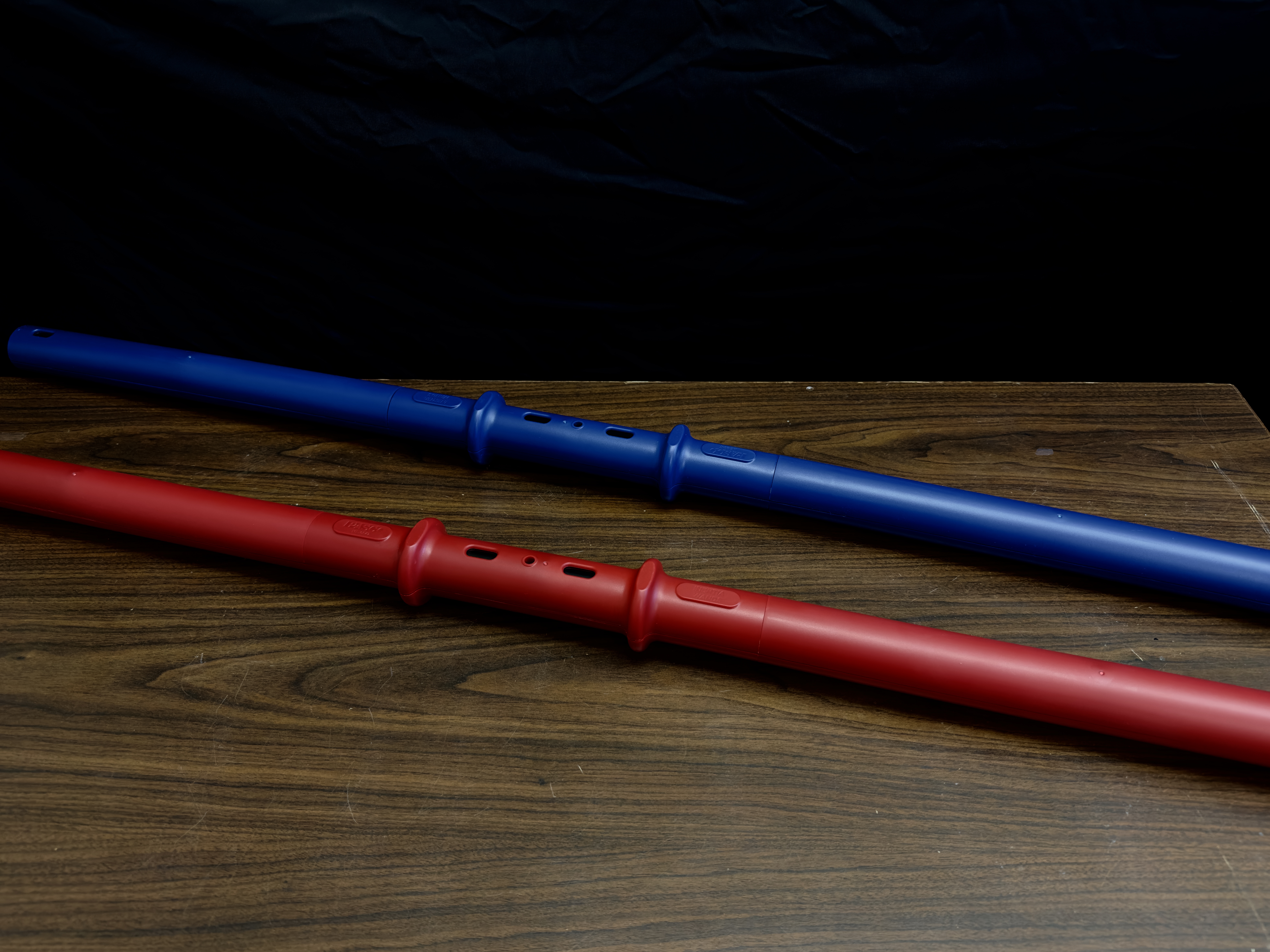 - The demonstration involves two rotational inertia wands of the same mass with different distributions. The red wand has two interior metal slugs at the center while the blue wand has two interior metal slugs at the ends.
