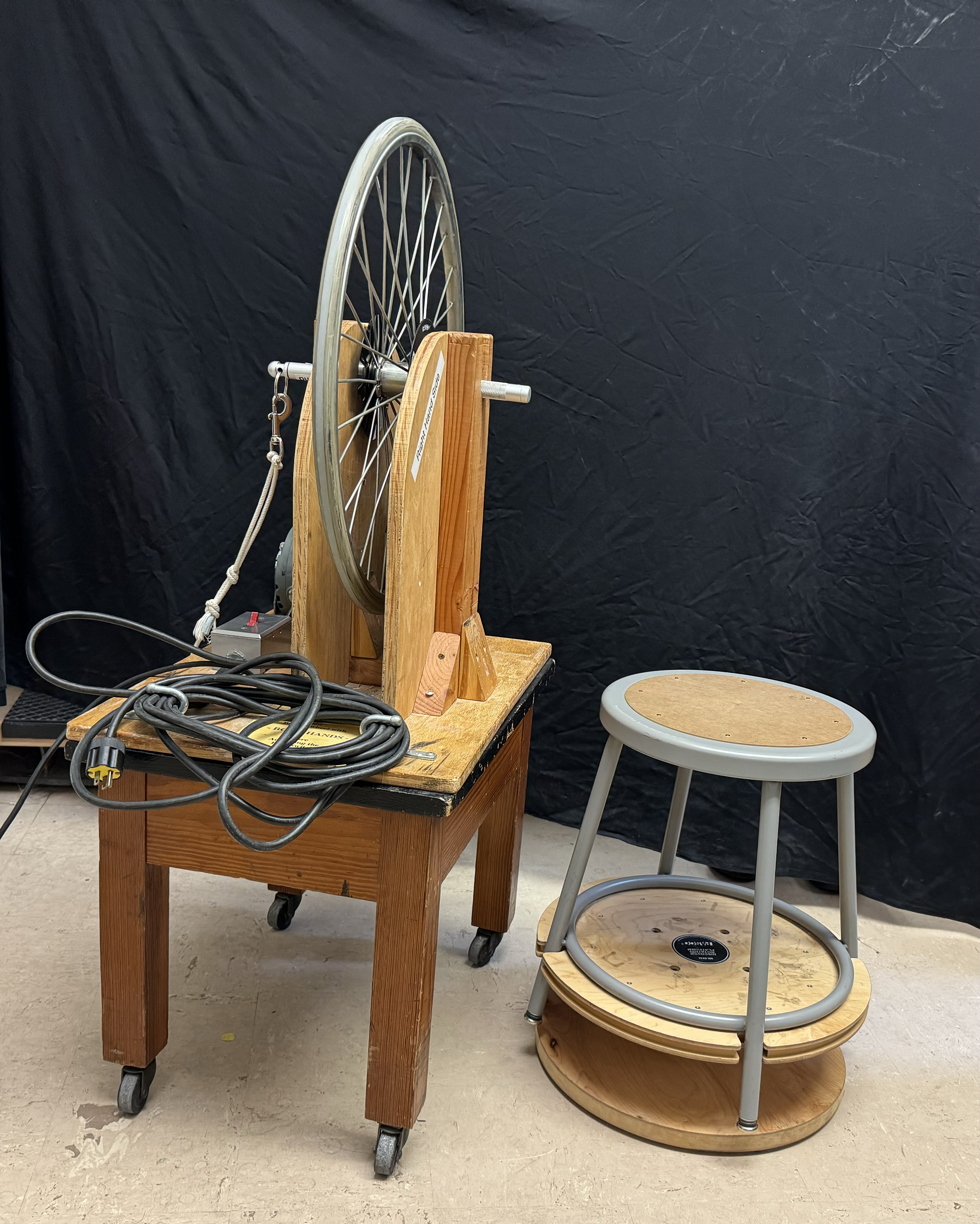- Spin the wheel using the switch on the apparatus, then sit on the stool.