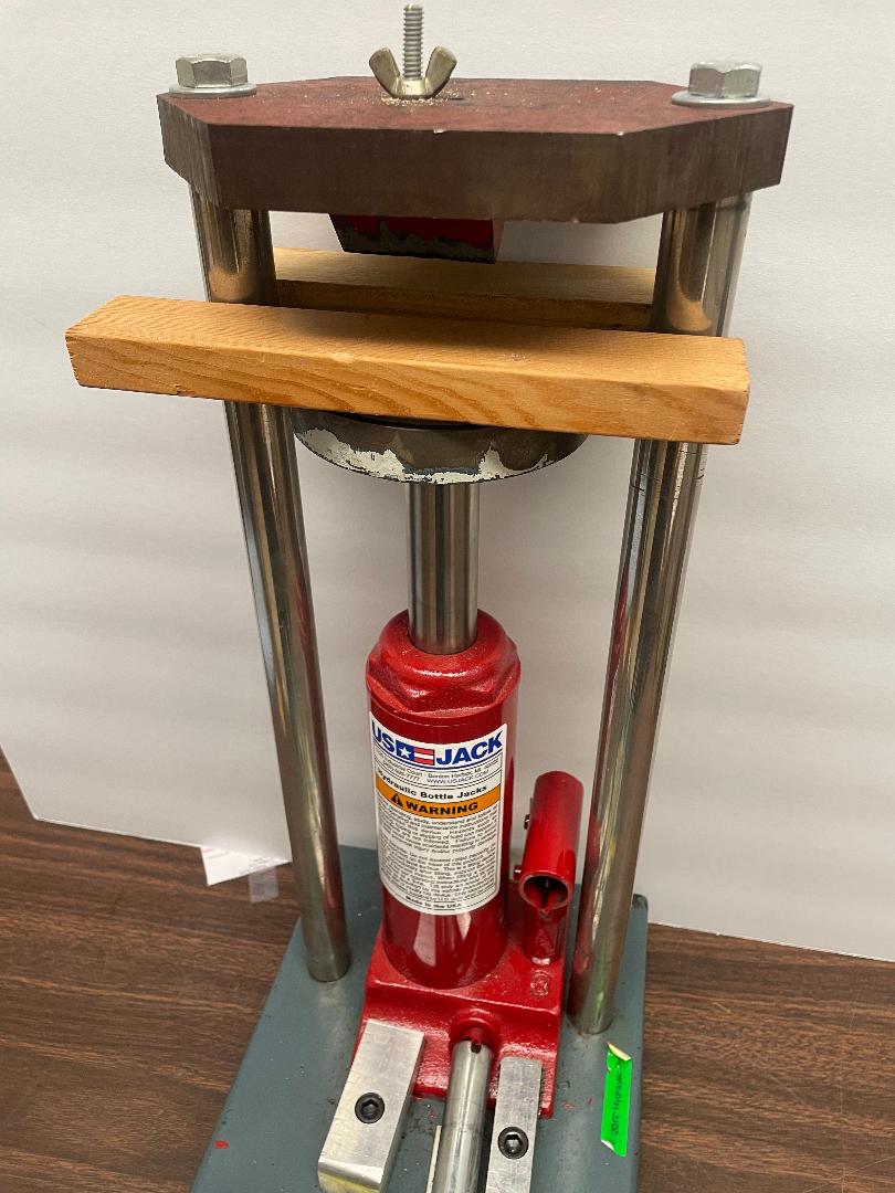 - Place two long pieces of wood on the outer edges of the hydraulic press platform placed horizontally as shown in the picture.