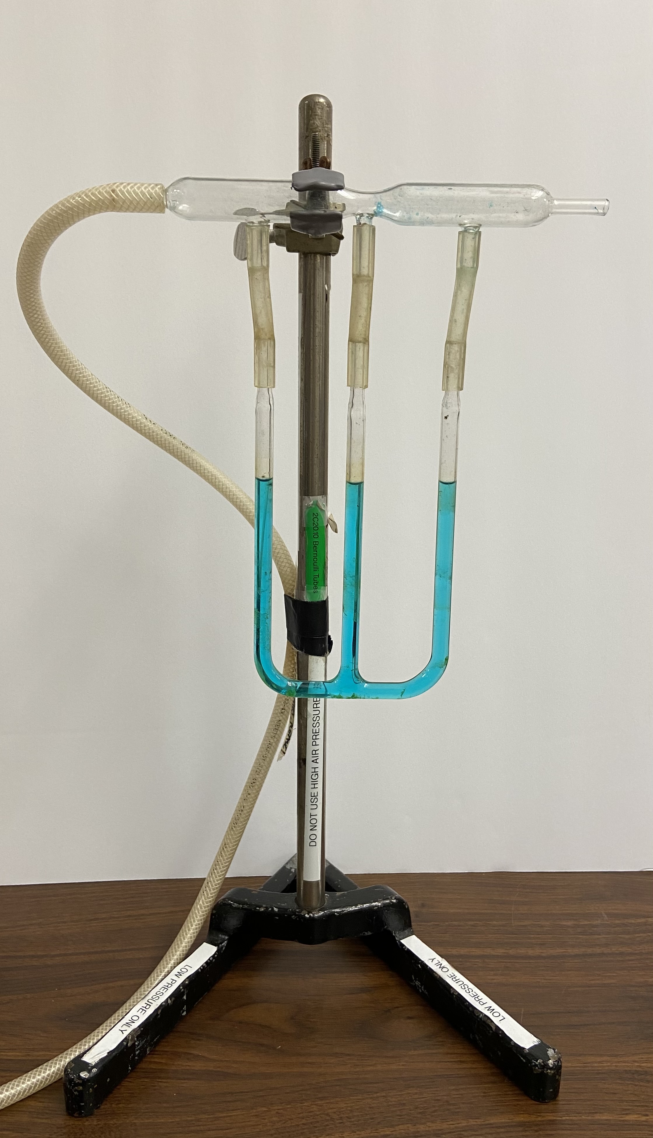 - Air passes through wide (outer) and then narrow (inner) pieces of the top of the glass tube. At the narrower piece, the air flows at a higher velocity than the wider pieces.